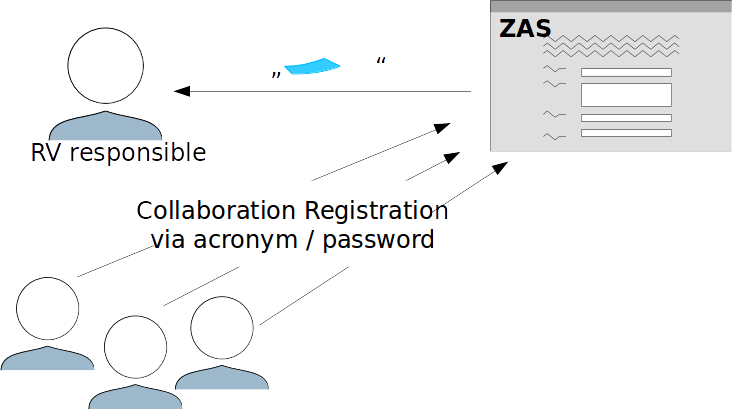Finally, the RV responsible gets the approval of the CAT, and the team members register themselves at the ZAS as described above using the acronym and the password: