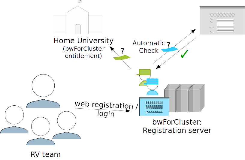 When the members of the RV team register themselves at the web registration of their bwForCluster, the registration server checks whether the home universities have issued the bwForCluster entitlements and whether the RV is approved: